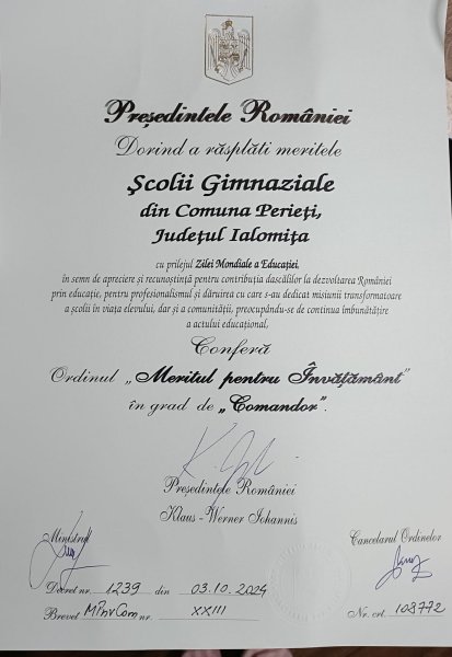 Scoala Perieti este decorata de presedintele Romanieii 2024